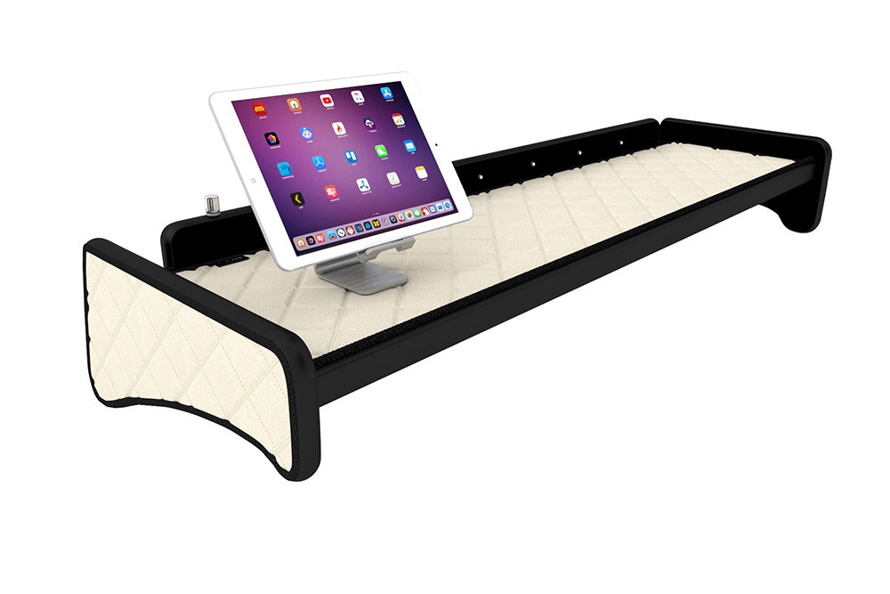 Prostřední police dlouhá (Řada Elegance) pro vozidla byla zhotovena z jakostní dřevěné desky zajišťující životnost a estetický vzhled. Výrobek je připevněn na palubní desce pomocí silného suchého zipu, díky tomu je nový plochý povrch stabilní a je možné na něj položit různé předměty; nejčastěji notebook nebo televizi. Krabice obsahuje návod s montážní sadou. Výrobky této řady se vyznačují materiály nejvyšší kvality, vysokou pečlivostí provedení a novátorskými technologickými řešeními. Deska police byla pokryta prošívanou syntetickou kůží. Přední panel je vybavený řadou LED diod osvětlujících desku police bílým směrovaným světlem. Toto řešení usnadňuje řidiči používání police během jízdy a na odpočívadlech v nočních hodinách. V horní levé části panelu se nachází otočný knoflík sloužící k lineárnímu nastavení intenzity světla.