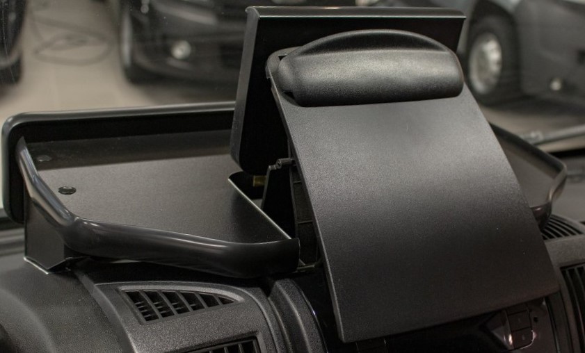 Stylová polička– poskytuje další prostor pro uložení vašich potřeb. Nožky poličky přesně reprodukují obrys povrchu palubní desky, takže stůl leží extrémně stabilně a 7 mm vysoká hrana a protiskluzová podložka zajistí, že váš počítač nebo telefon zůstane po celou dobu cesty v bezpečí.