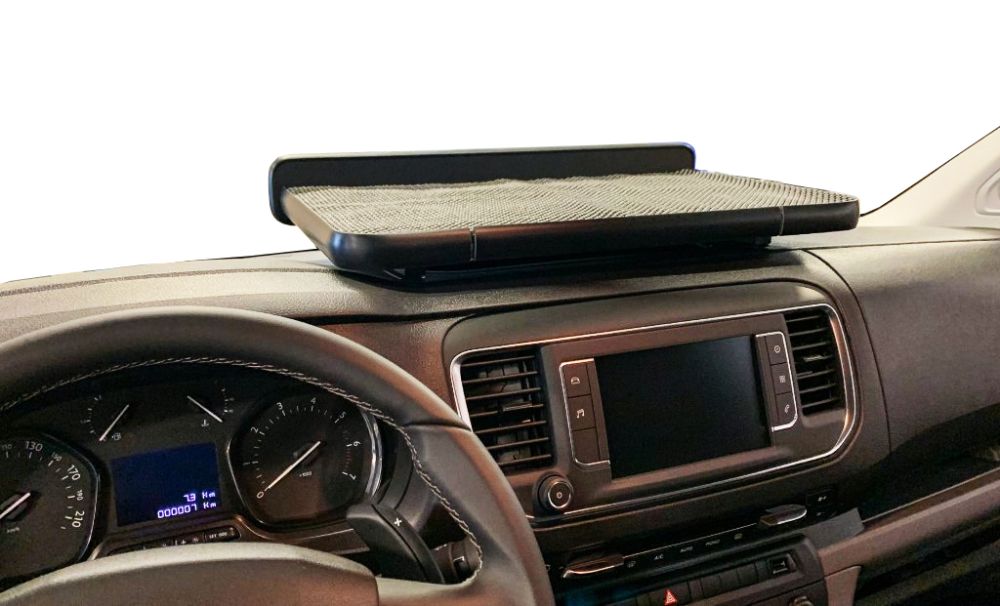Stylová polička– poskytuje další prostor pro uložení vašich potřeb. Nožky poličky přesně reprodukují obrys povrchu palubní desky, takže stůl leží extrémně stabilně a 7 mm vysoká hrana a protiskluzová podložka zajistí, že váš počítač nebo telefon zůstane po celou dobu cesty v bezpečí.
